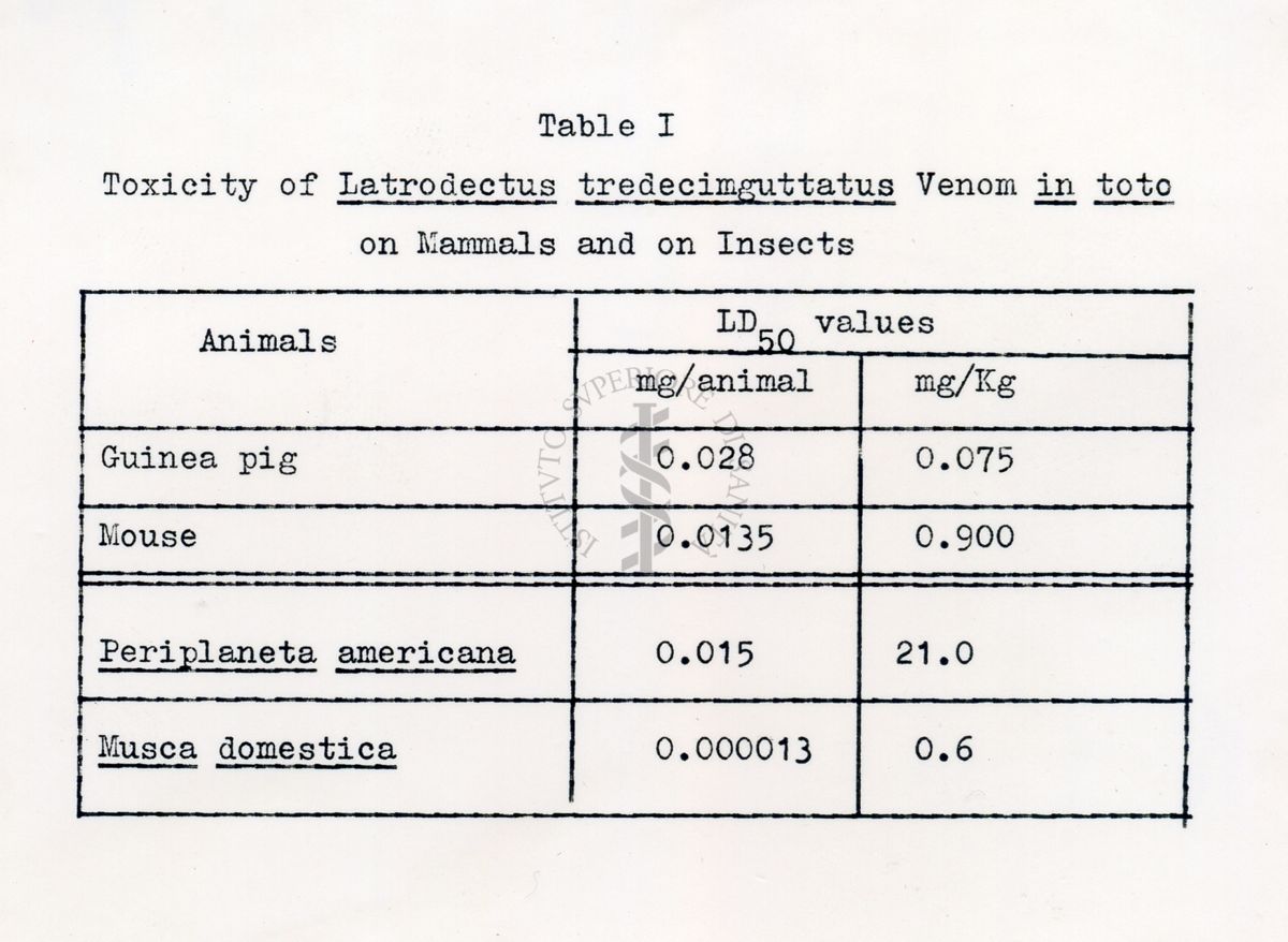 Studi biochimici sul veleno di Latrodectus tredeciguttatus ovvero sulla vedova nera mediterranea, o malmignatta (Latrodectus tredecimguttatus). E' un ragno appartenente alla famiglia Theridiidae